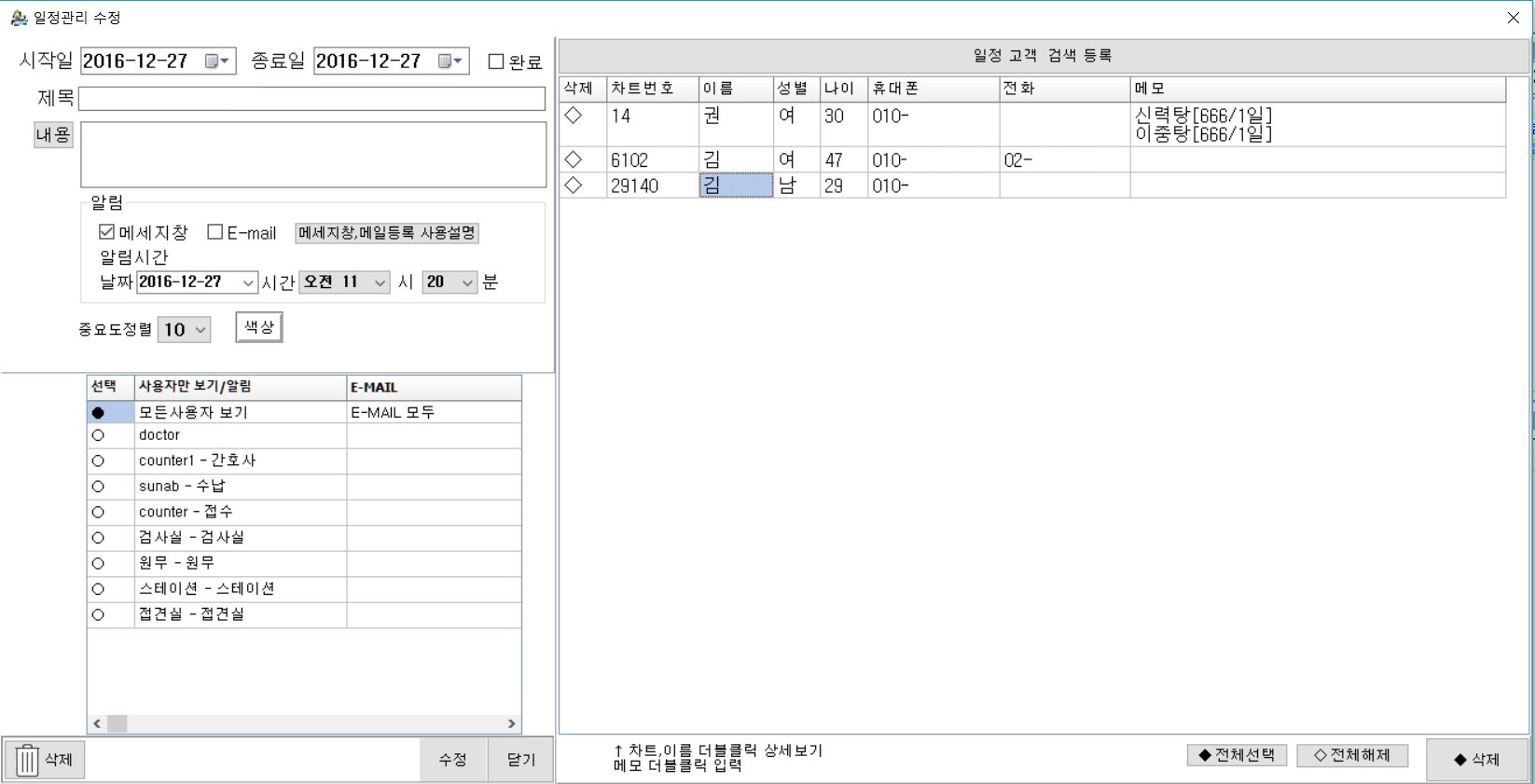 예약창에서 환자 검색시 동명이인인경우 최종내원일 정렬로 최근 진료한환자의 정보를 상단으로 검색이 가능합니다.