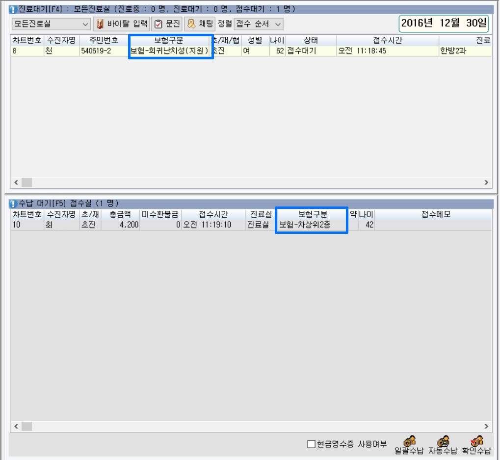 접수실 접수및수납시 보험구분에 보험세부정보가 추가됩니다.