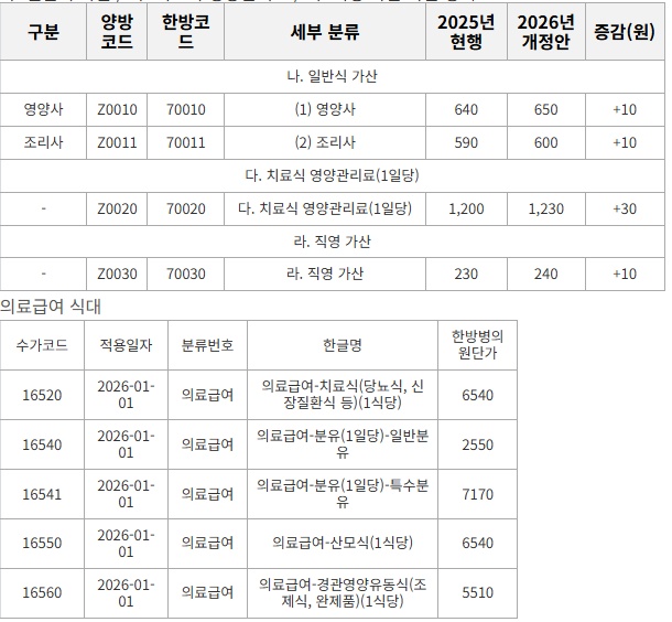 나. 일반식 가산 / 다. 치료식 영양관리료 / 라. 직영 가산 가산 항목