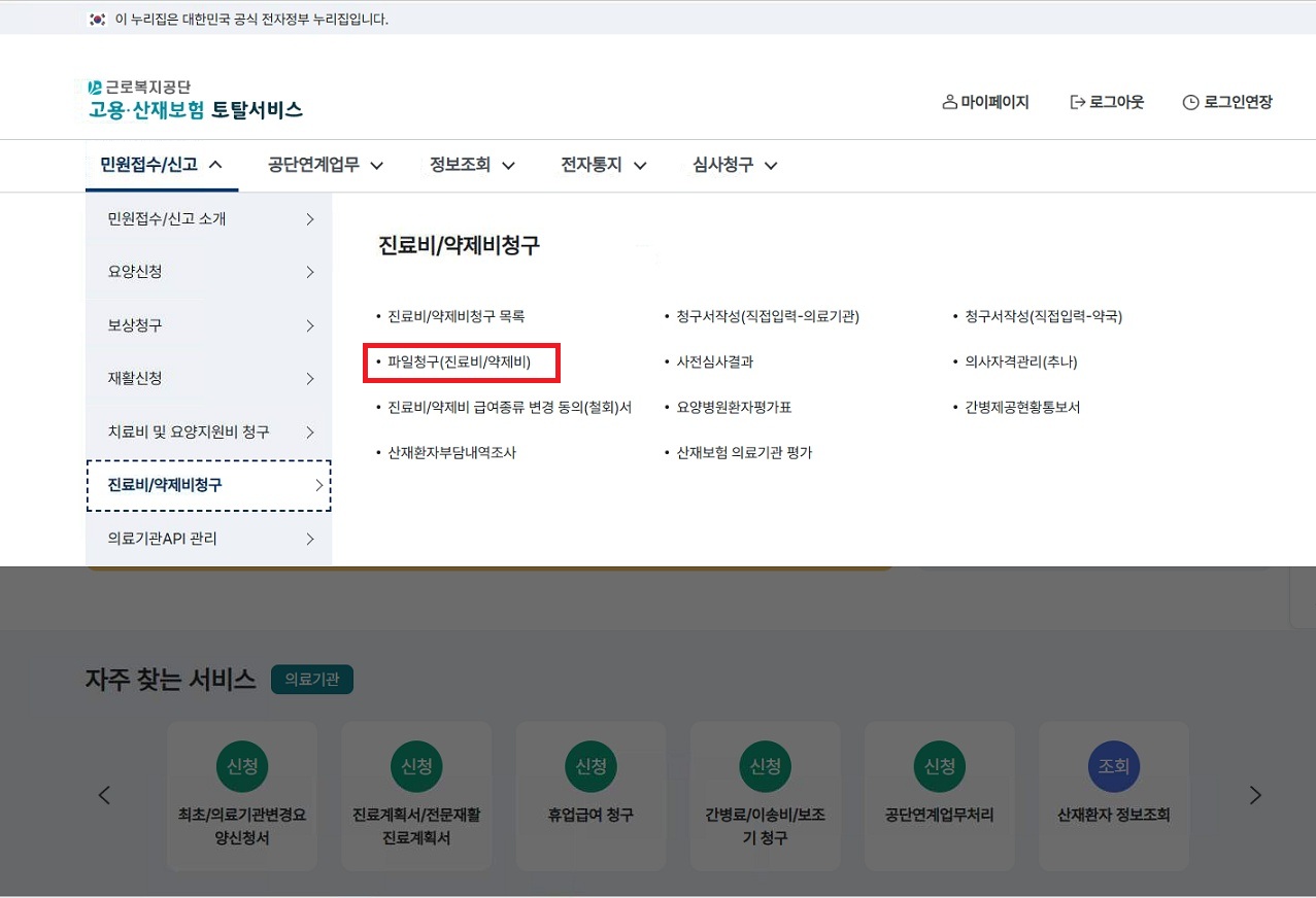 민원접수/ 신고 -> 진료비 약재비 청구 -> 파일청구(진료비/약재비) 선택