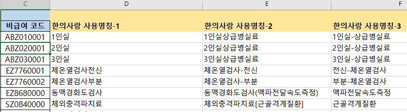 기초자료실 한글명칭에 맞는  '비급여 코드' 입력합니다.