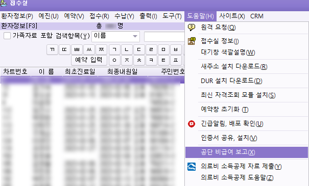 비급여 추출 프로그램은 접수실 상단 메뉴-> 도움말-> '공단 비급여 보고' 실행