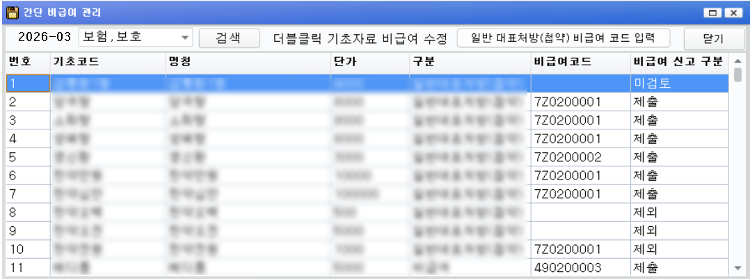 기초자료실 비급여코드 입력, 관리
