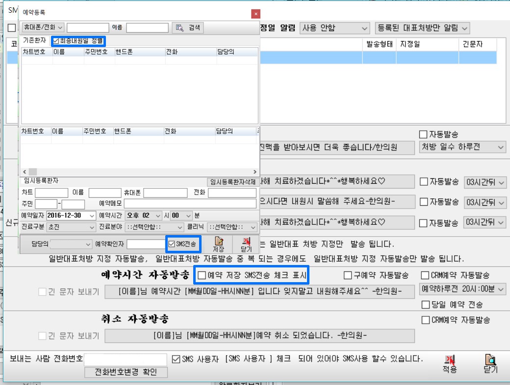 SMS 자동발송설정에서 예약 저장 SMS 전송 체크 한경우 예약창에서 SMS 전송 여부를 선택할 수 있습니다.