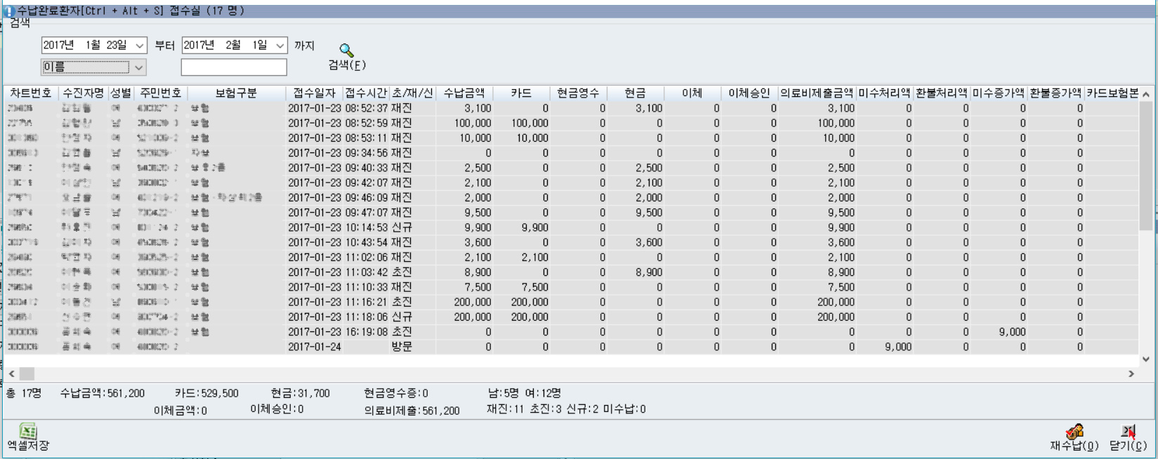 접수실 완료 환자로 일통계로 활용할 수 있도록 수납, 미수금내역 조회 기능이 추가되었습니다.