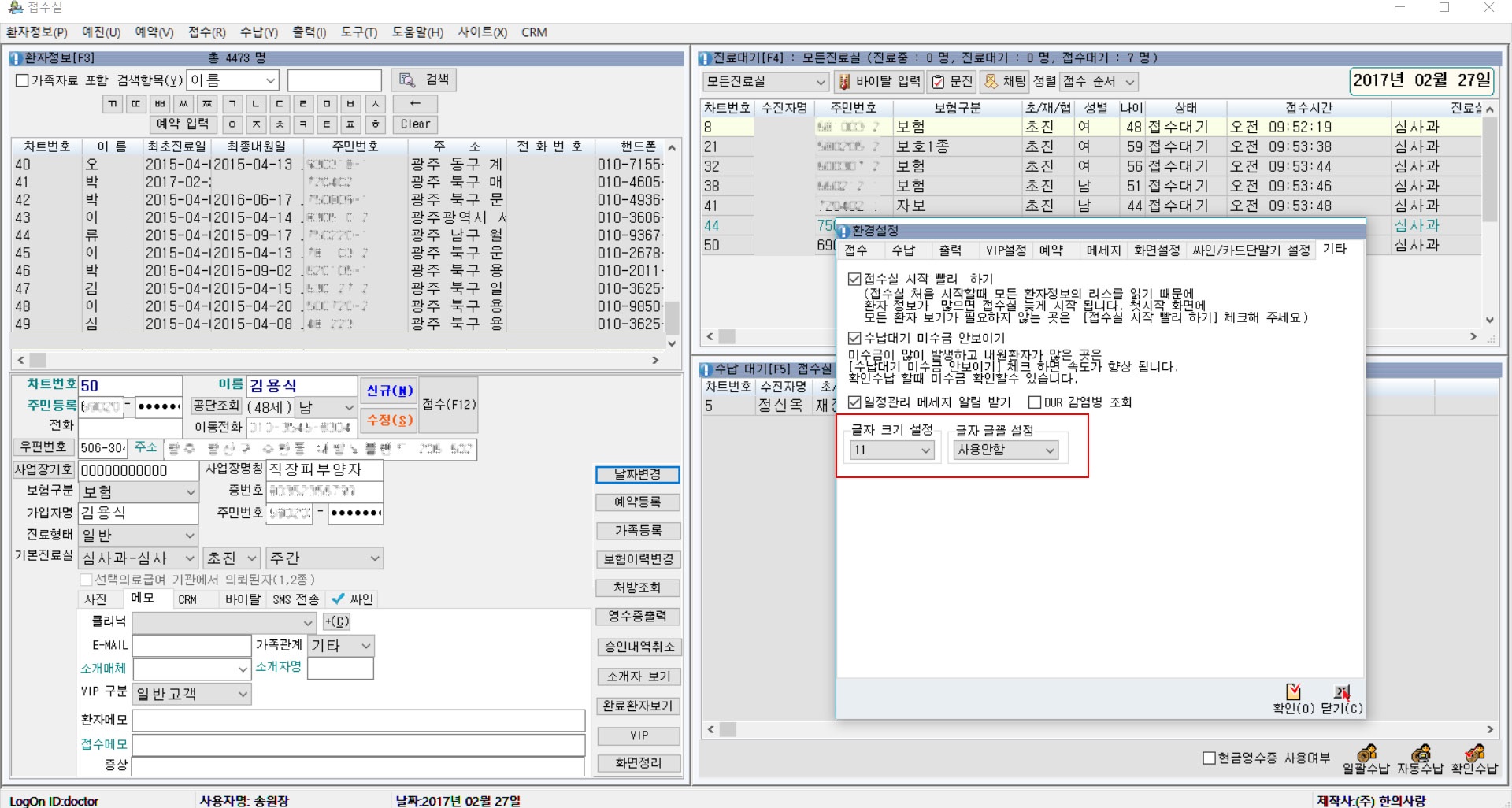 접수실 -> 도구 -> 환경설정 -> 기타   글자 크기설정및 글자 글꼴 설정옵션을 선택할 수 있습니다.