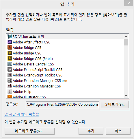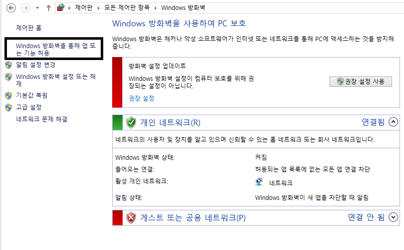 -> windows 방화벽을 통해 앱또는 기능 허용 선택