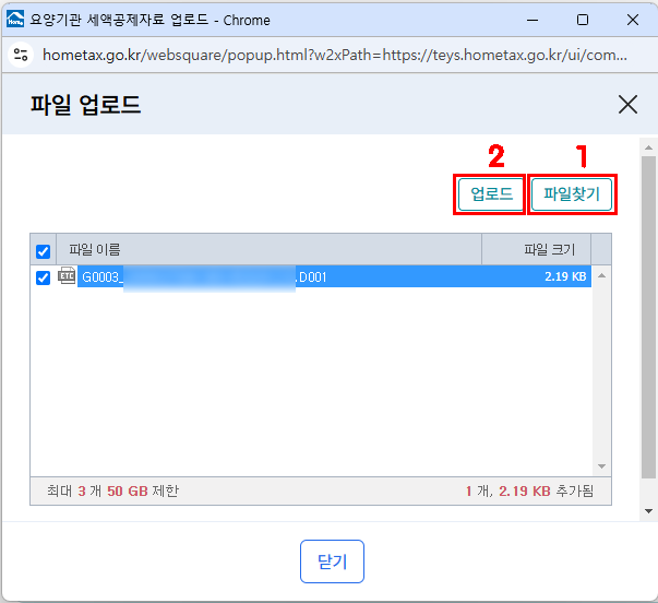 파일 찾기 선택 했다면 '업로드  2 클릭'  창 닫기