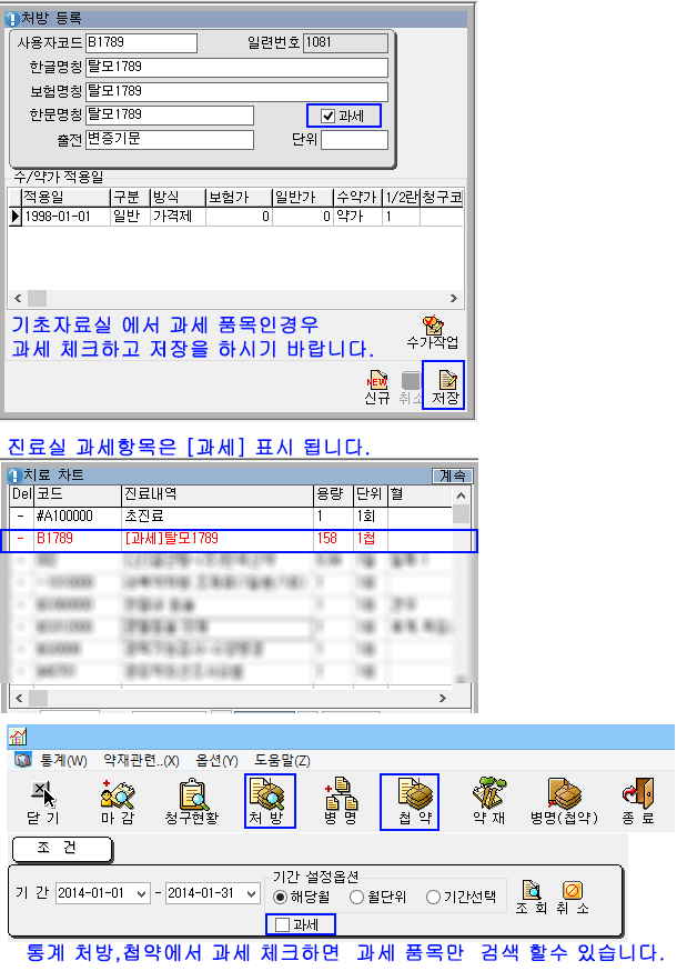 * 한의사랑 과세 등록, 진료실 표시, 통계 조회 안내.*