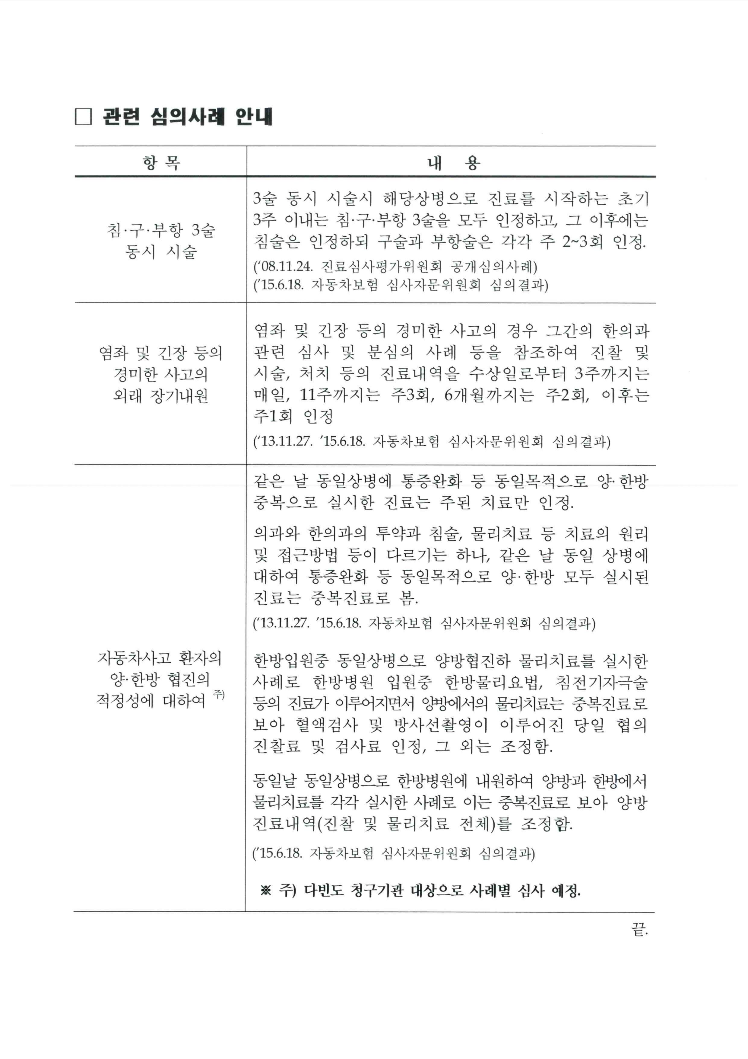 다종의 진료항목에 대한 한방 자동차보험진료수가 심사관련 안내입니다.